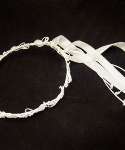 Kranz in weiß mit Perlen, Blüten und Satin Bändern.