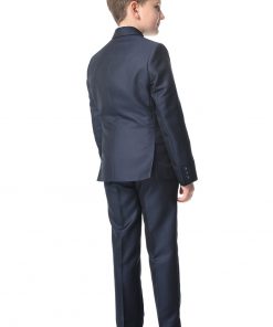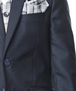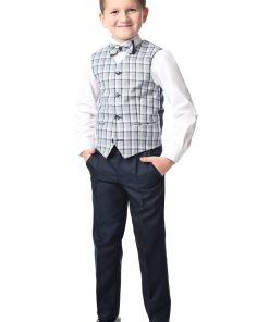 KOMMUNIONANZUG ENZO ist ein 5-teiliger Festanzug für Jungs mit karierter Weste, bestehend aus Sakko, Weste und Hose, Fliege und Poschette.