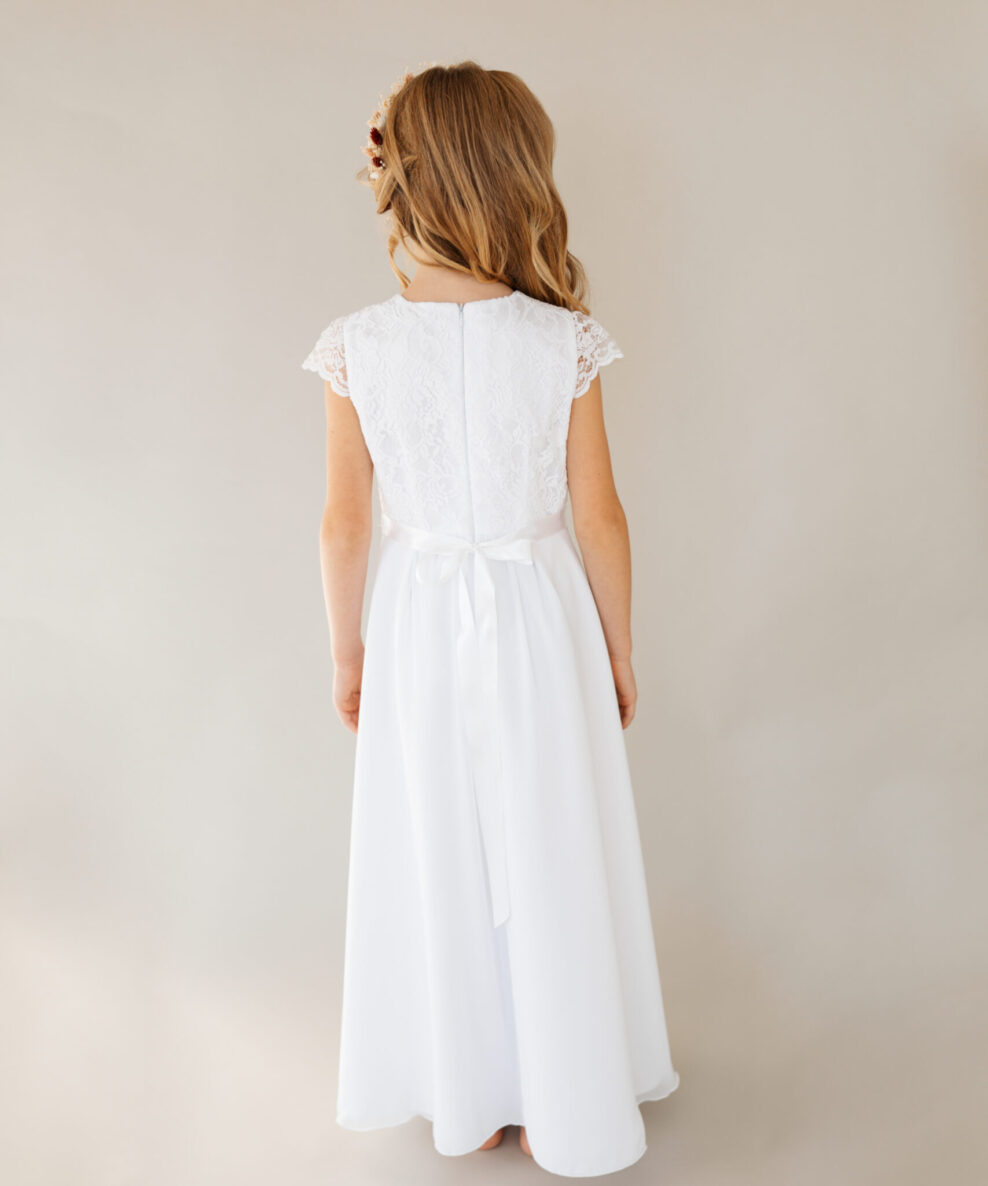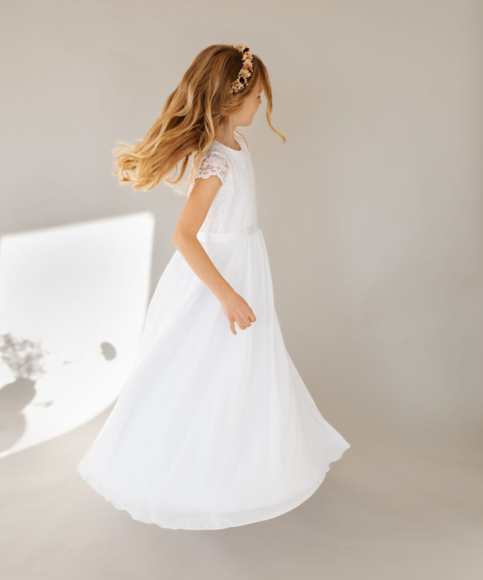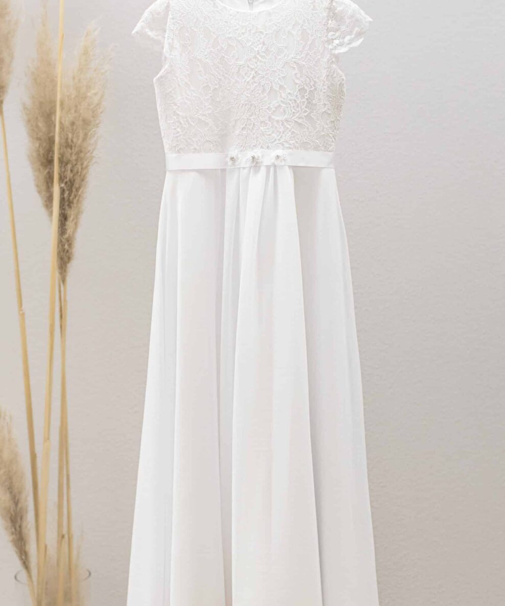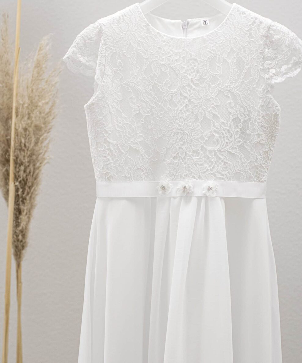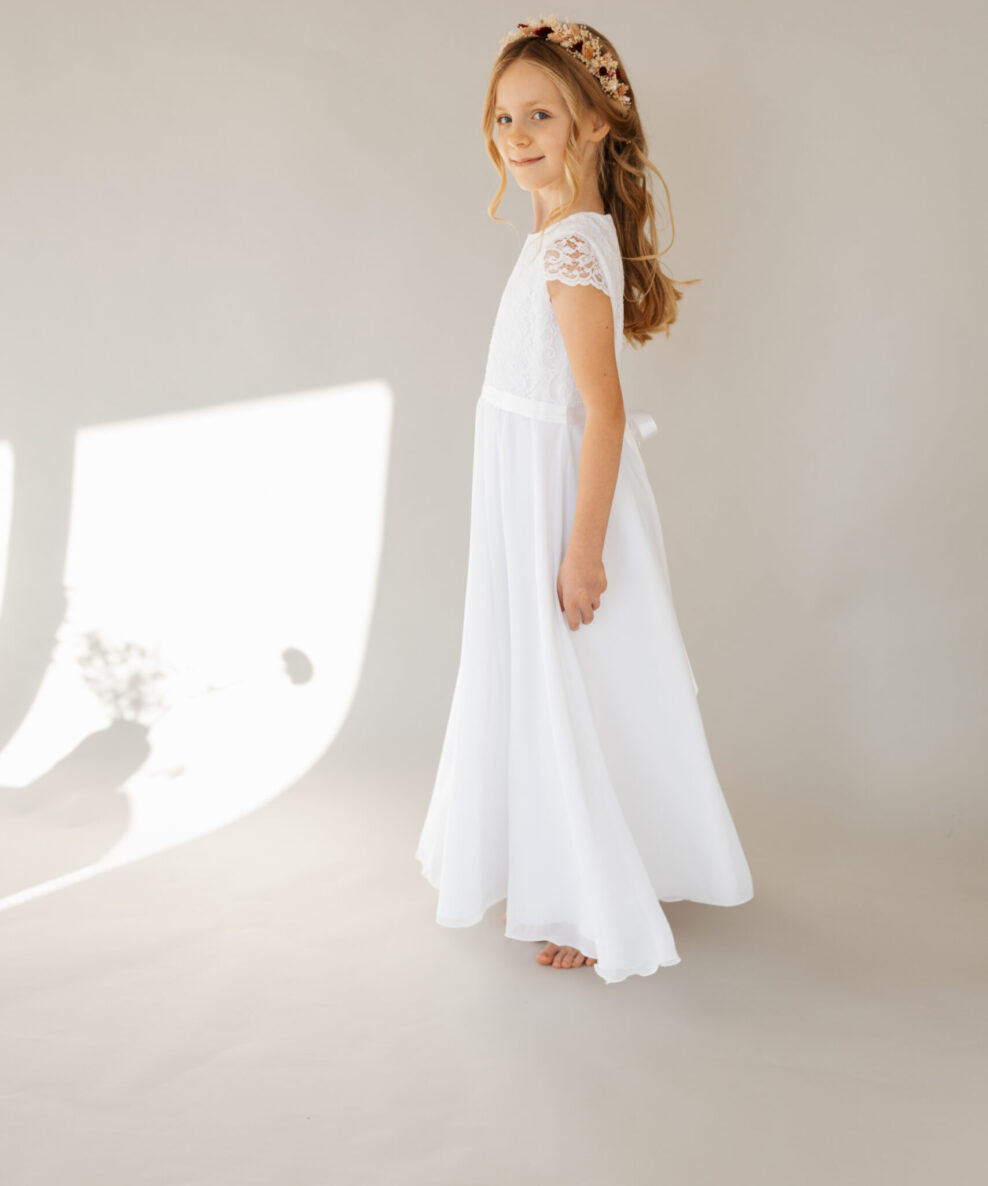 Unser schlichtes Kommunionkleid Annabell, mit fließendem Chiffonrock, floralem Spitzenoberteil und kleinen Ärmelchen stammt aus unserer eigenen Kollektion.