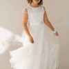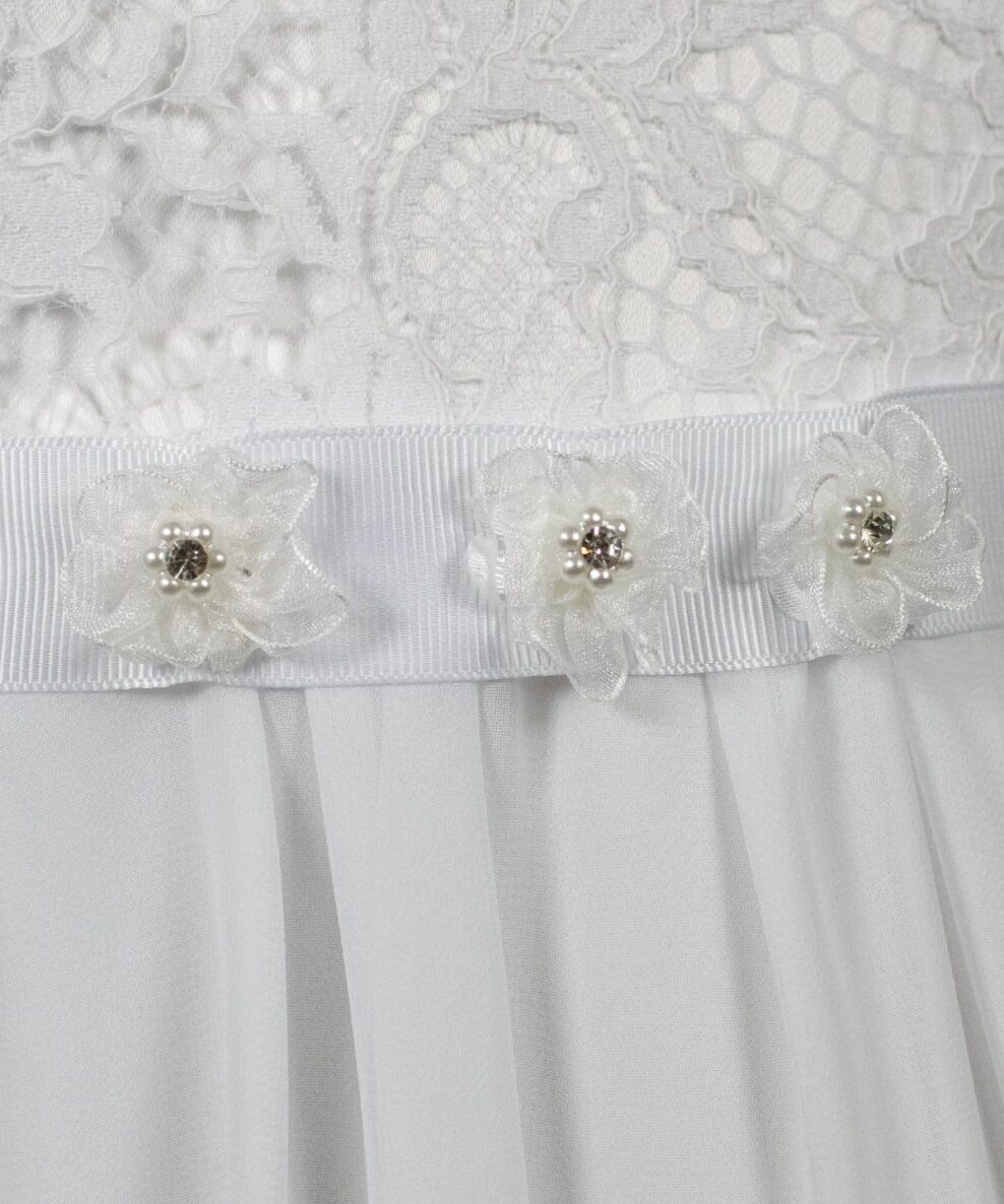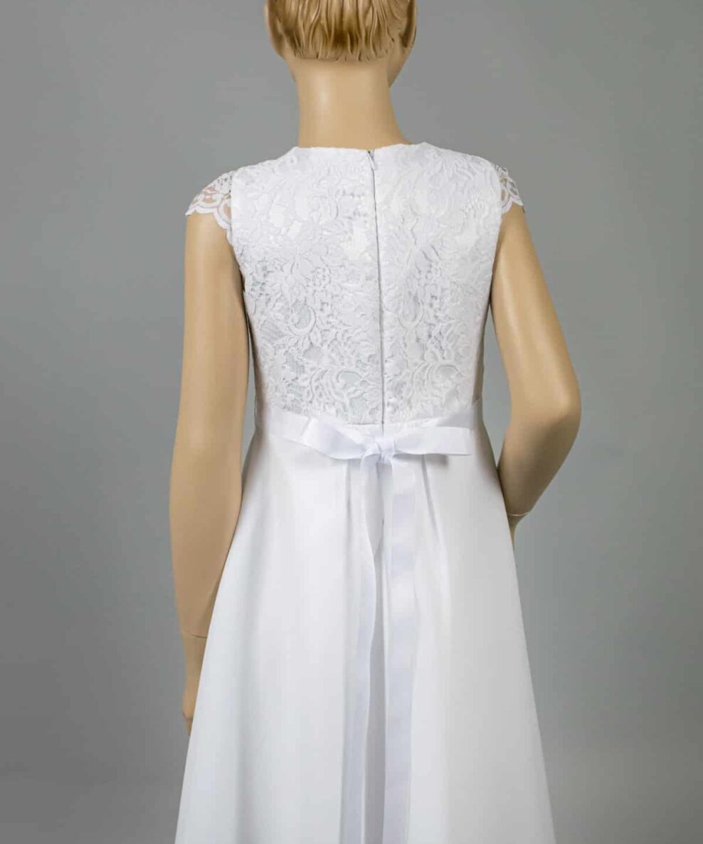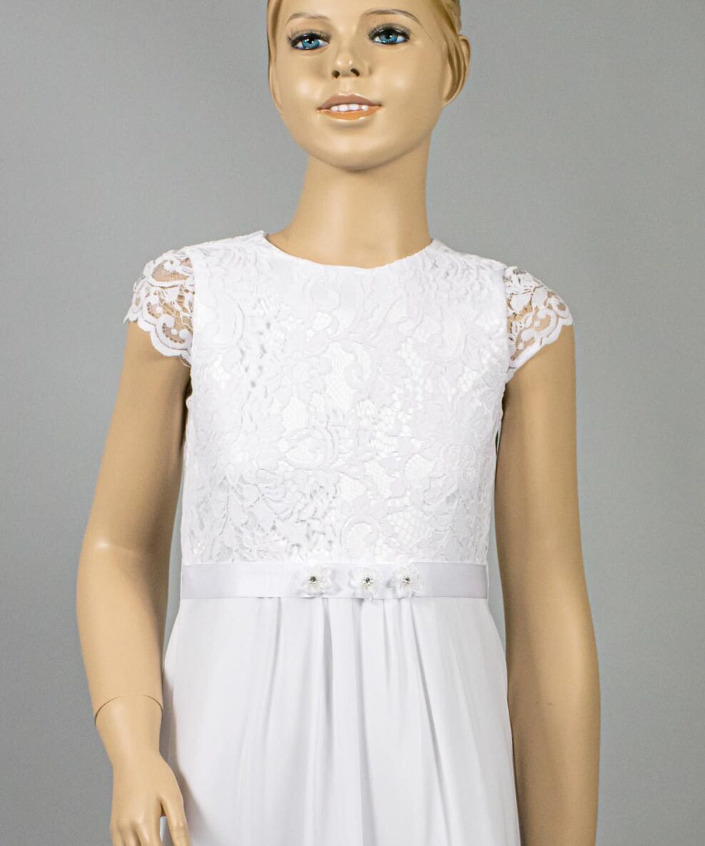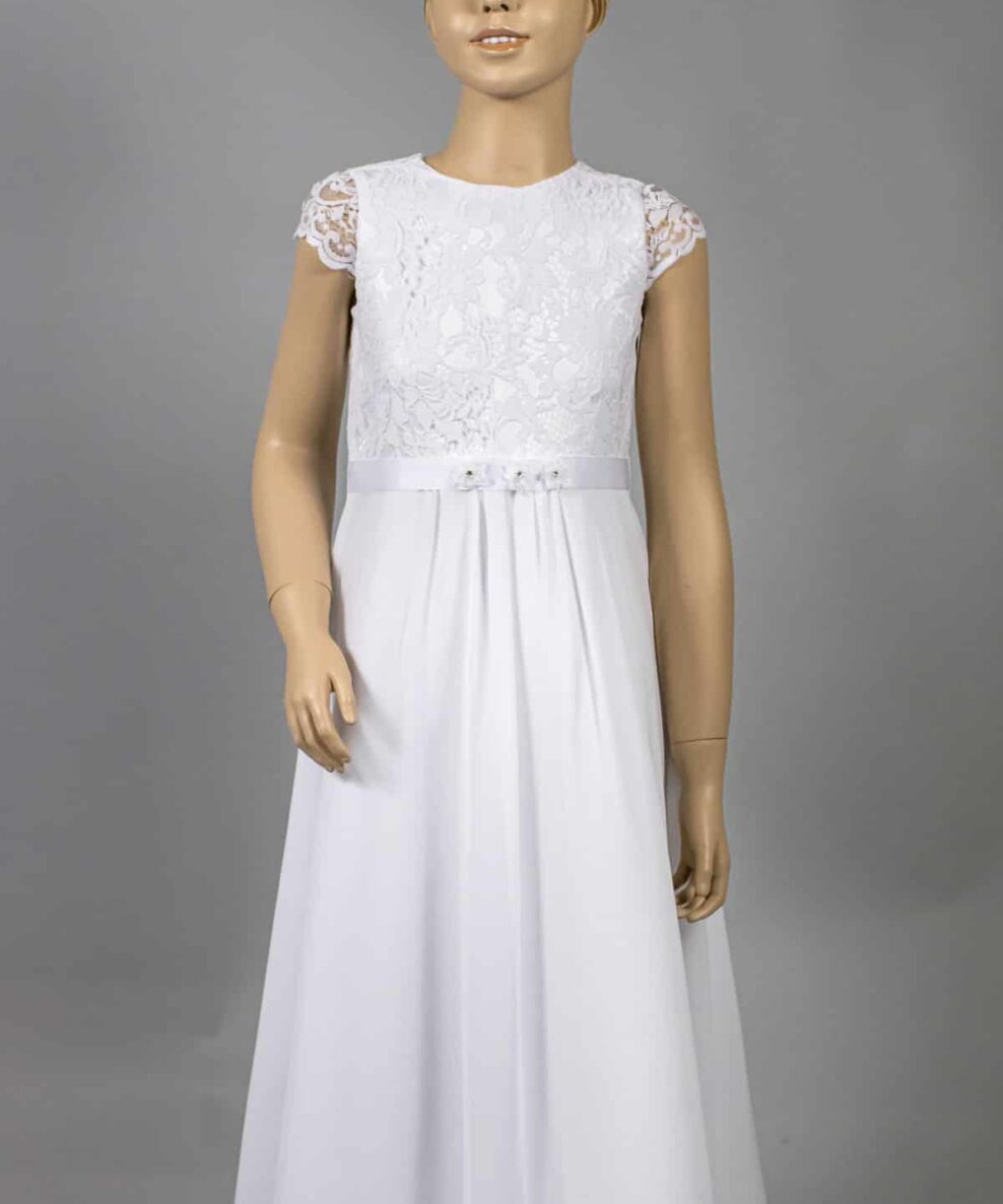 Unser schlichtes Kommunionkleid Annabell, mit fließendem Chiffonrock, floralem Spitzenoberteil und kleinen Ärmelchen stammt aus unserer eigenen Kollektion.