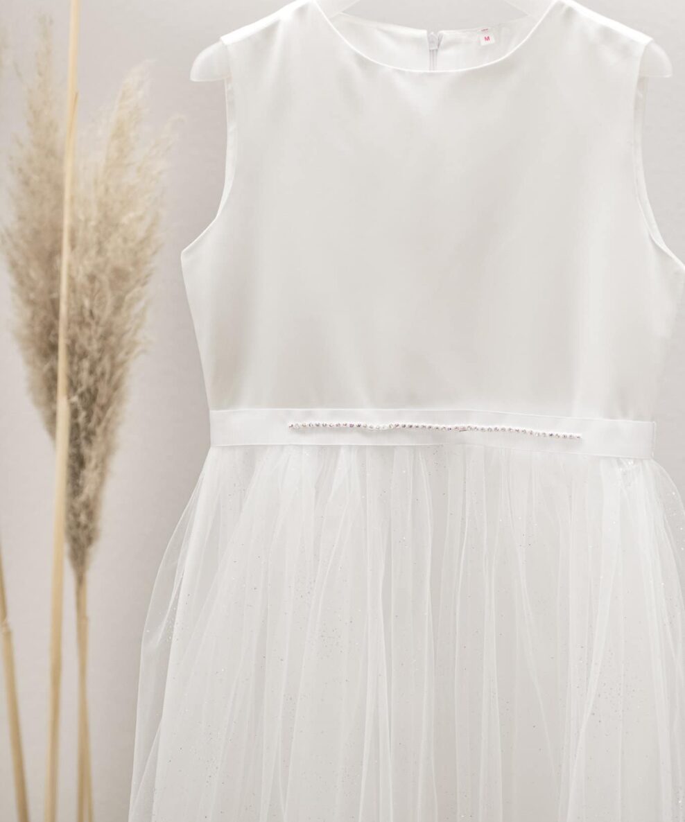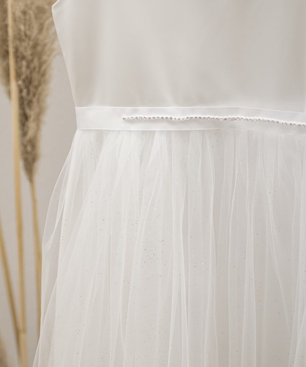 Unser Kommunionkleid „Elsa“ ist ein schlichtes Kommunionskleid aus Satin und Glitzertüll.
