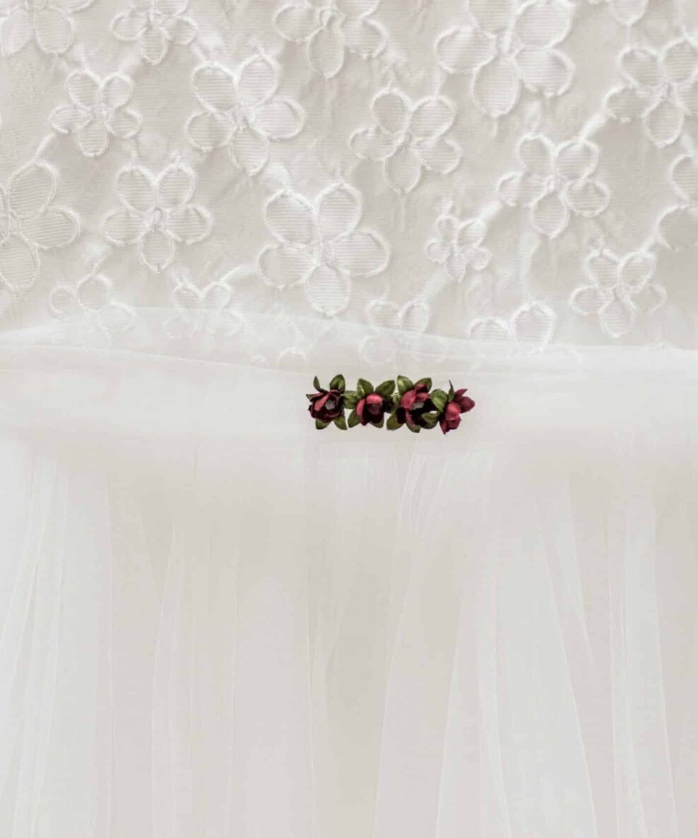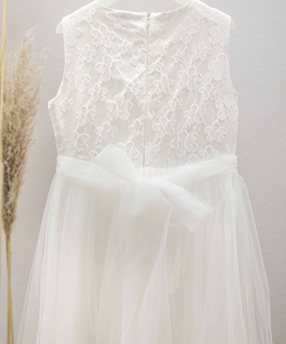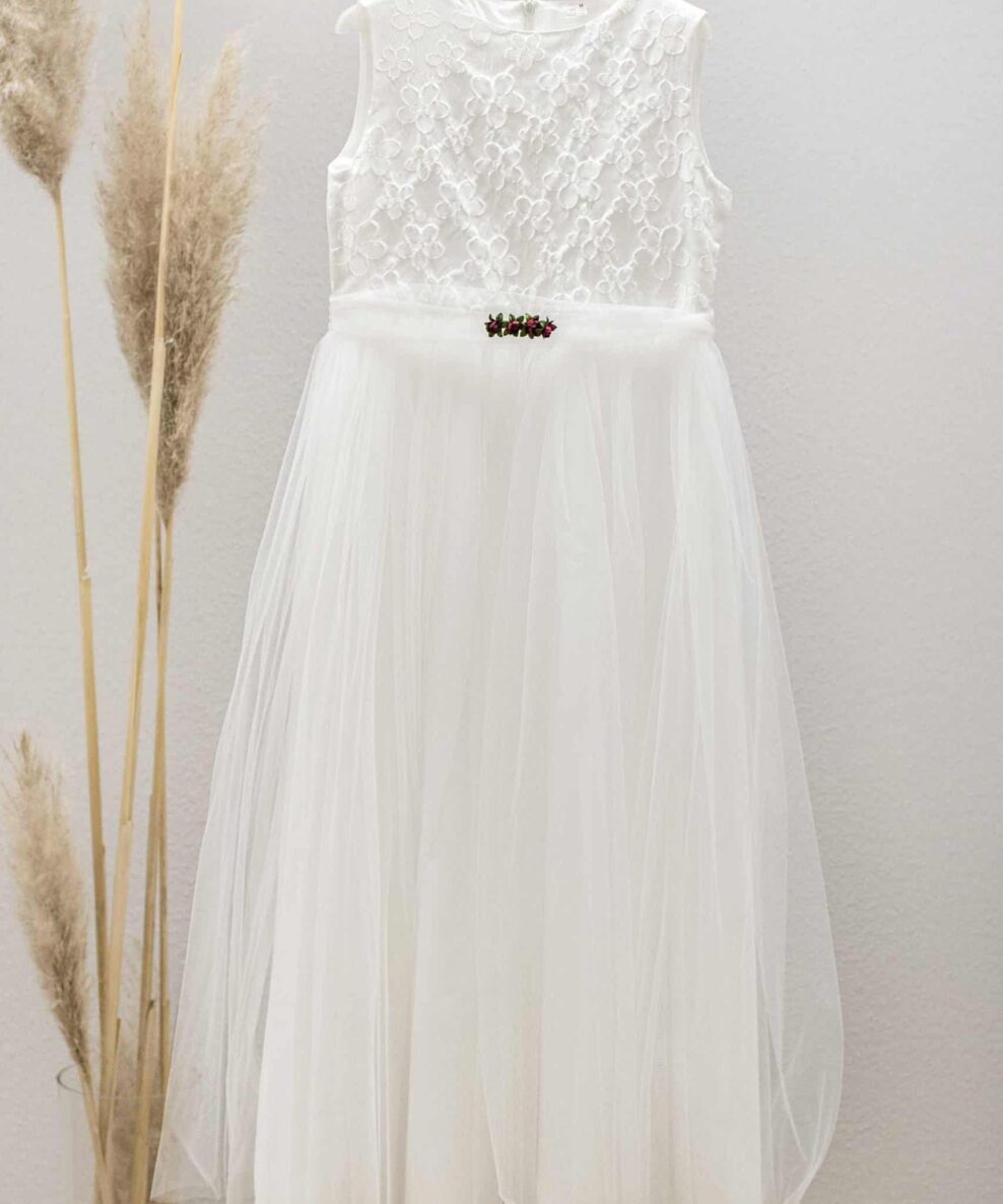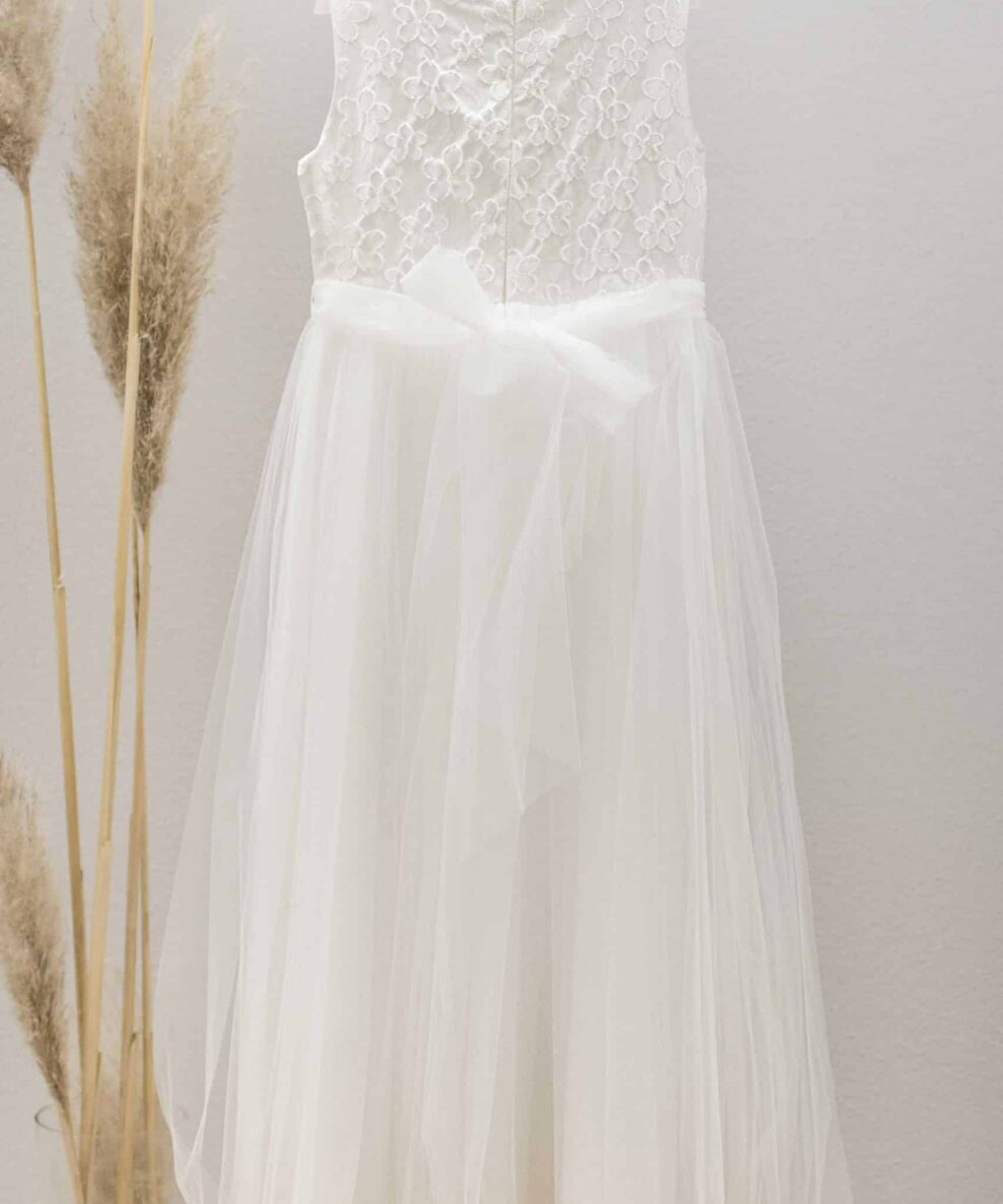 Unser Kommunionkleid „Jasmin“ ist ein langes Kommunionskleid mit floraler Spitze im Oberteil und einem langen Tüllrock.
