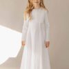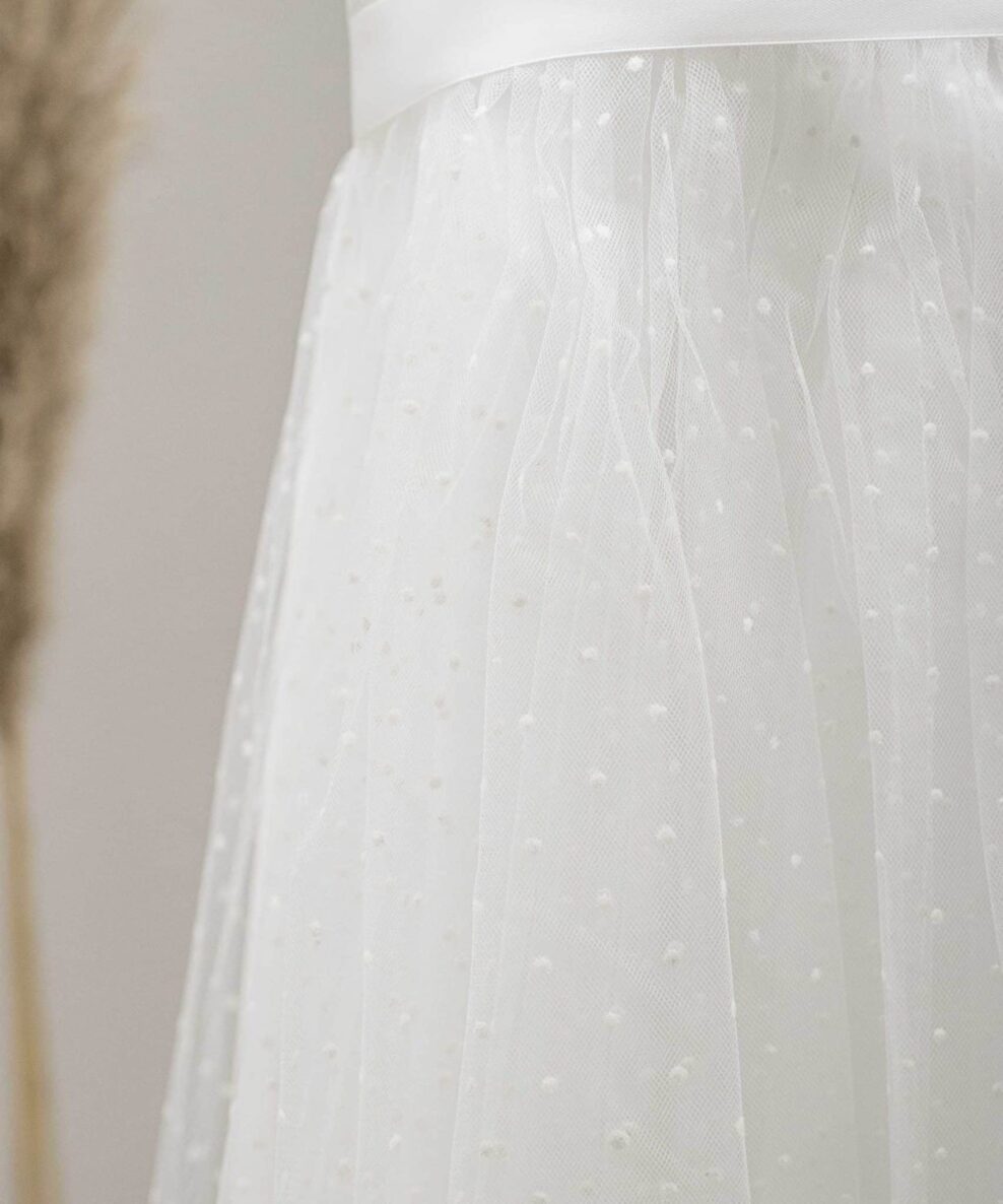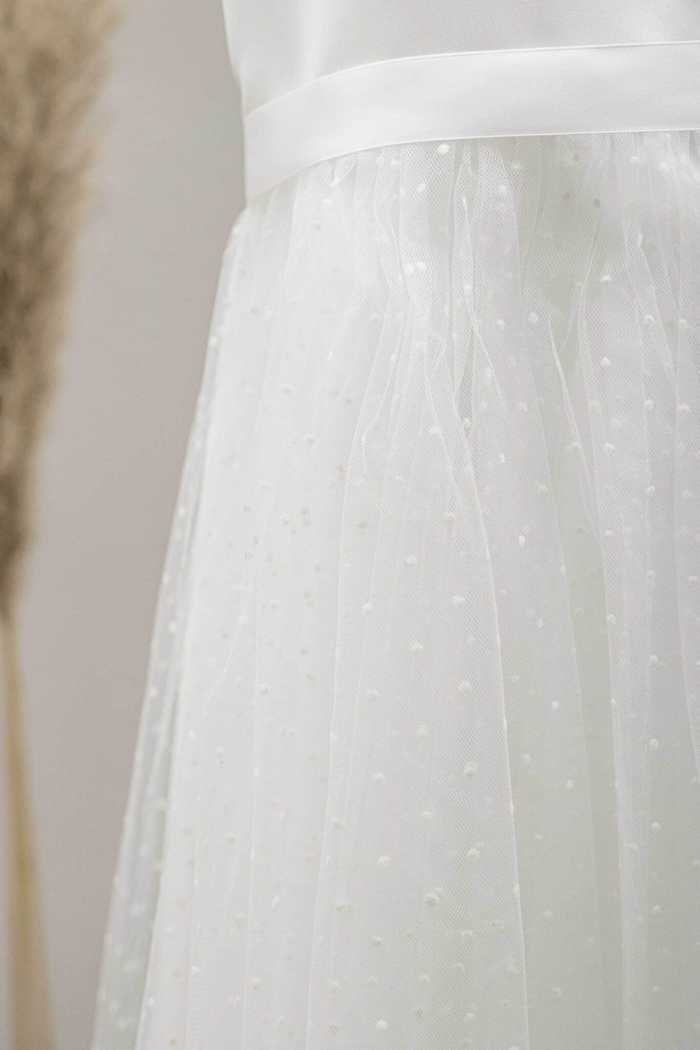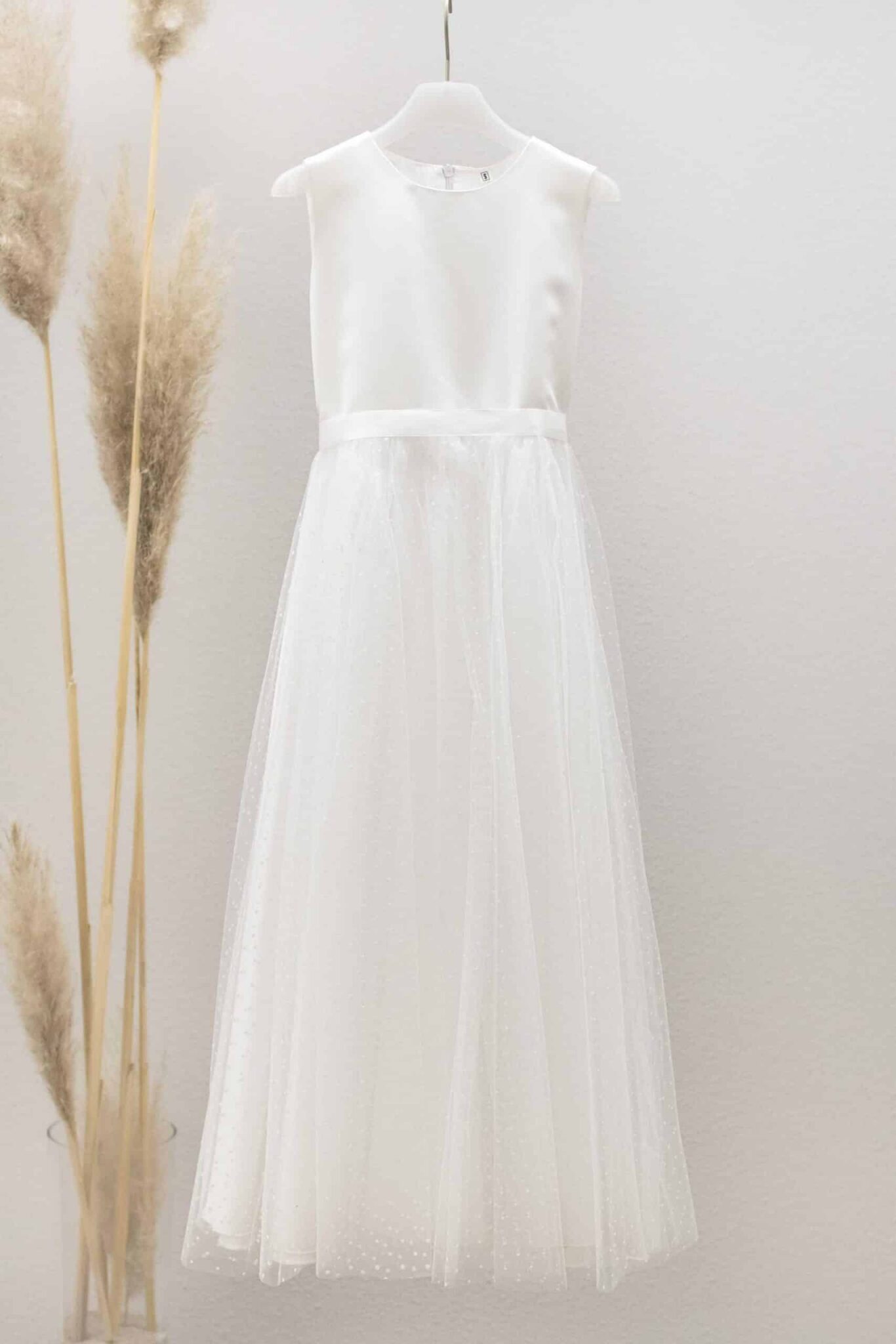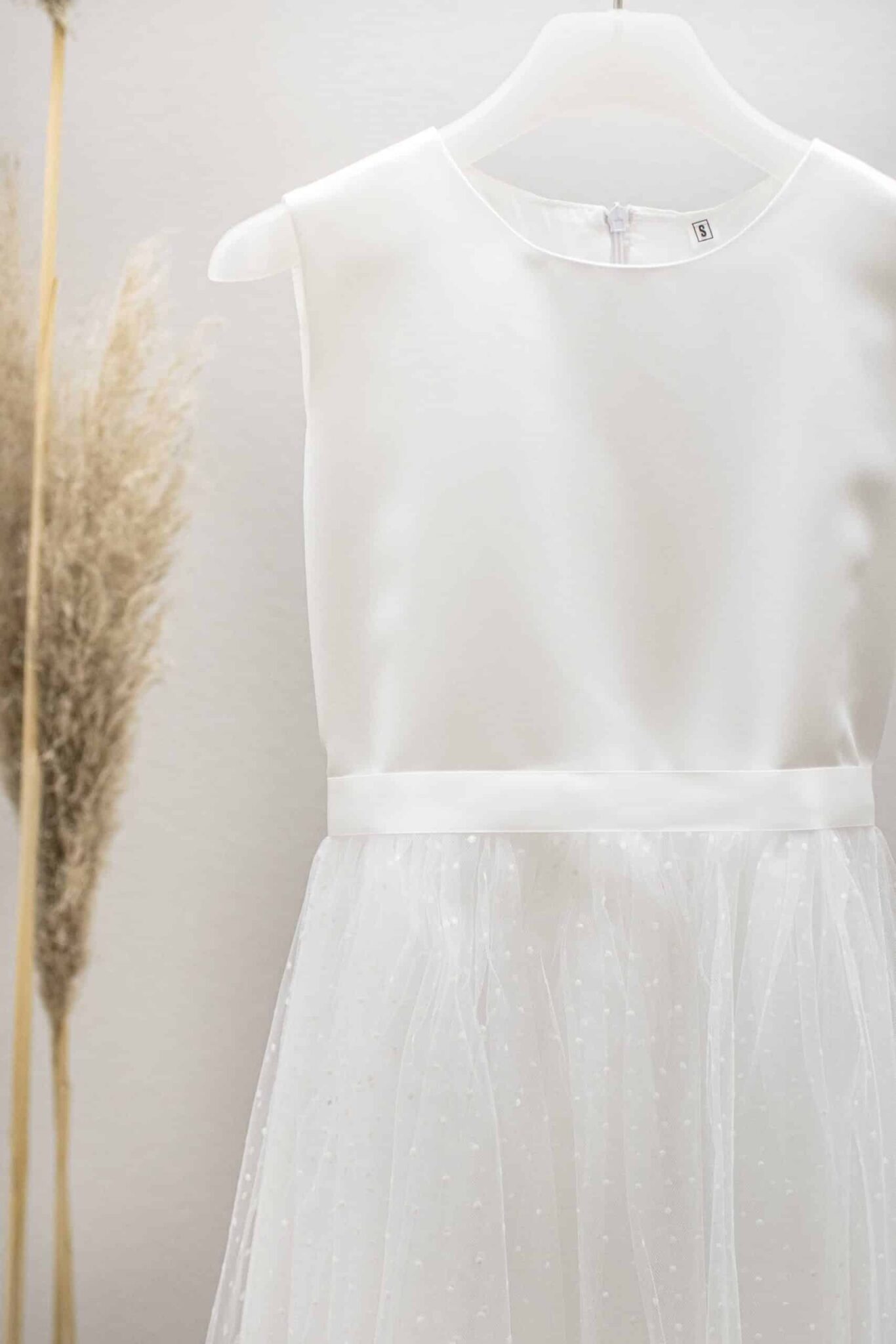 Unser Kommunionkleid „Rina“ ist ein schlichtes Kommunionskleid aus Satin und Pünktchentüll.